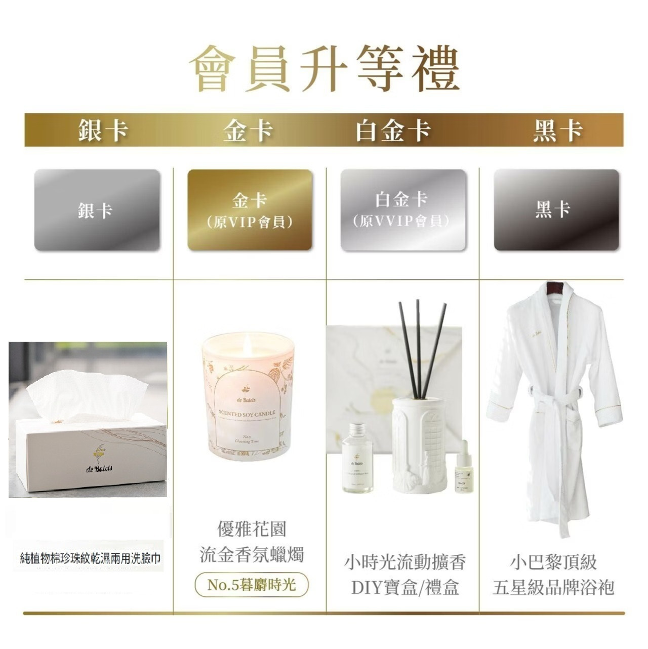 - 【升等禮】:若普卡升等為銀卡、金卡、白金卡、黑卡時,可獲得升等禮。(若領過該等級會員禮,即便更改品項也無法再次領取)
